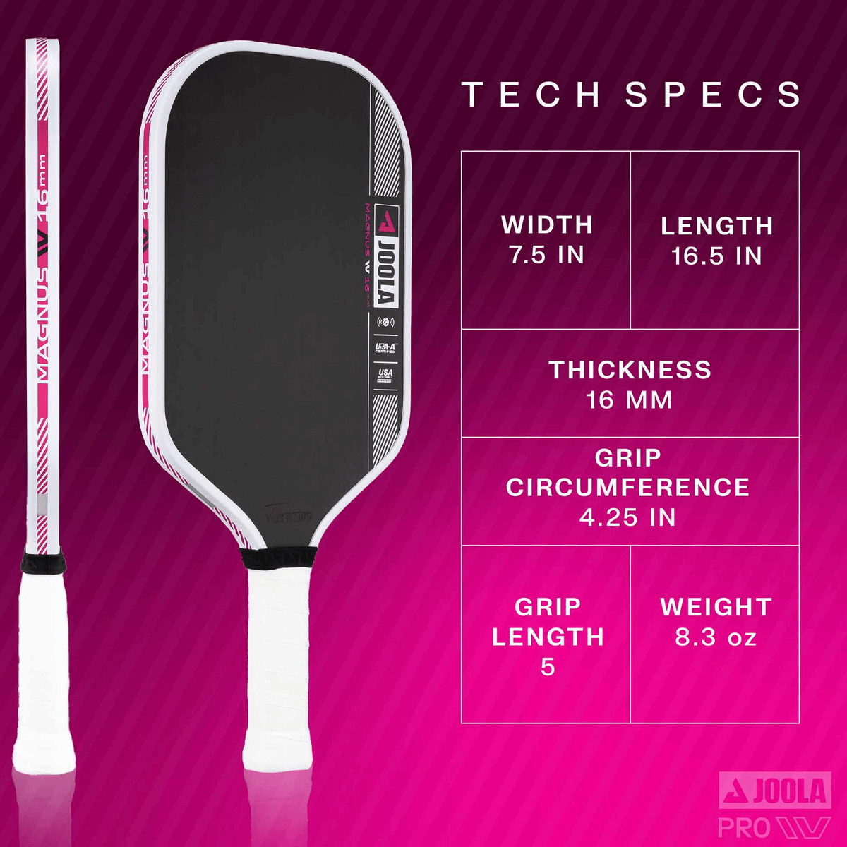 The JOOLA Tyson McGuffin Magnus Pro IV 16mm pickleball paddle is UPA-A pro Certified and USAP PBCoR .43 Certified.